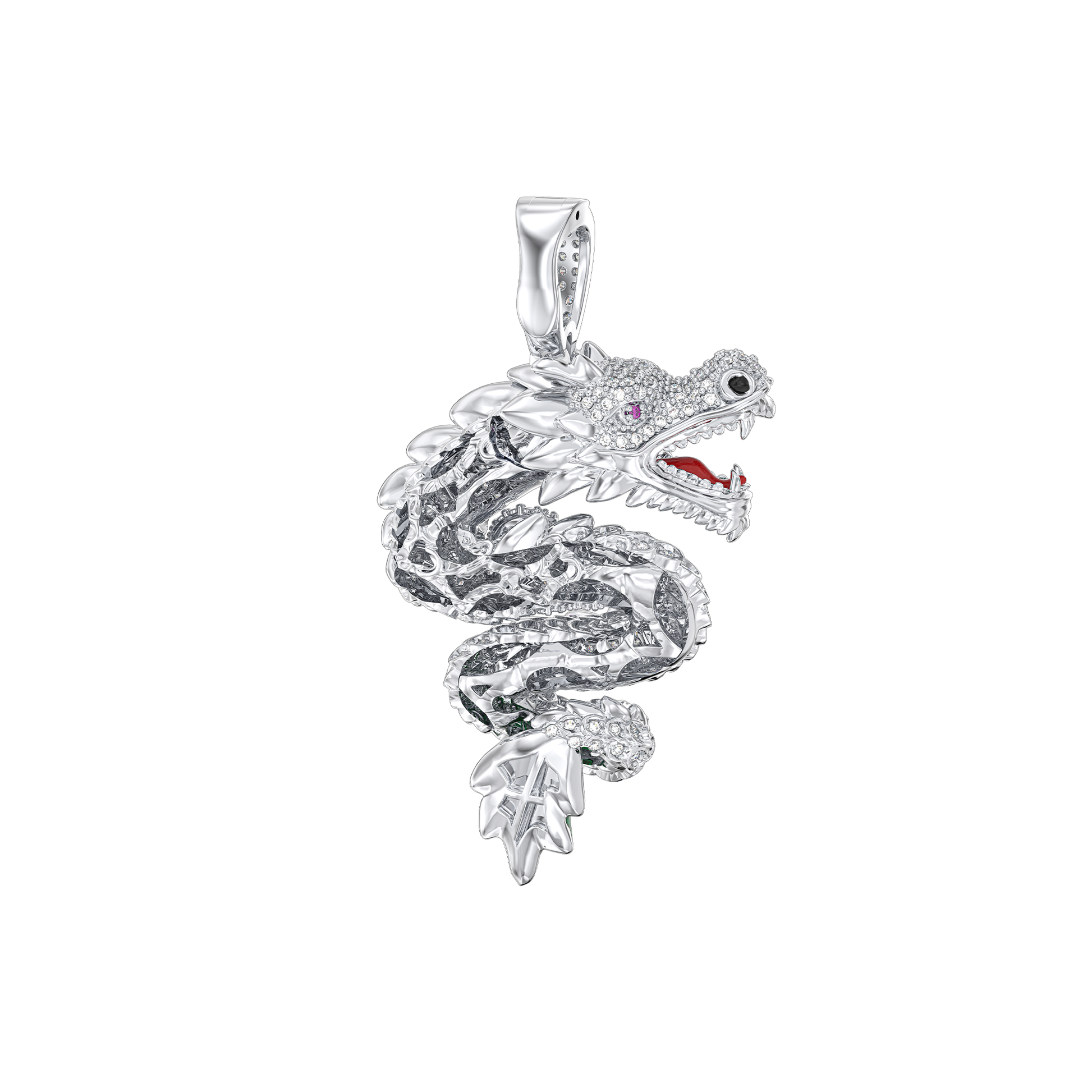 Encrusted with cubic zirconia for a dazzling effect, it features striking accents—a purple stone, ruby-colored eye, and emerald-toned leaf, bringing this mythical creature to life. The intricate craftsmanship and bold design make this pendant a powerful statement piece for those who embrace daring style.