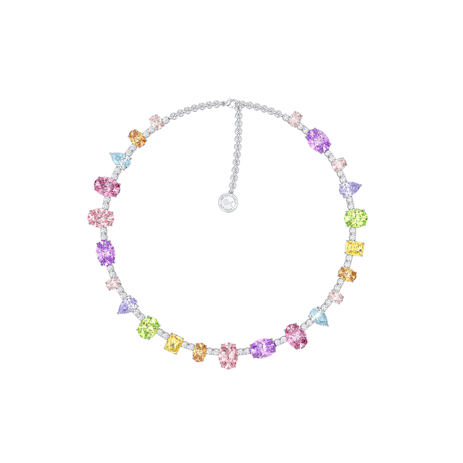 The Rainbow Prism Necklace is a celebration of color and sparkle. Featuring a vibrant array of multicolored stones, each in unique shapes and cuts, this necklace radiates with playful elegance. Its dazzling design adds a pop of personality to any outfit, making it the perfect statement piece for those who love bold, colorful accessories that shine from every angle.